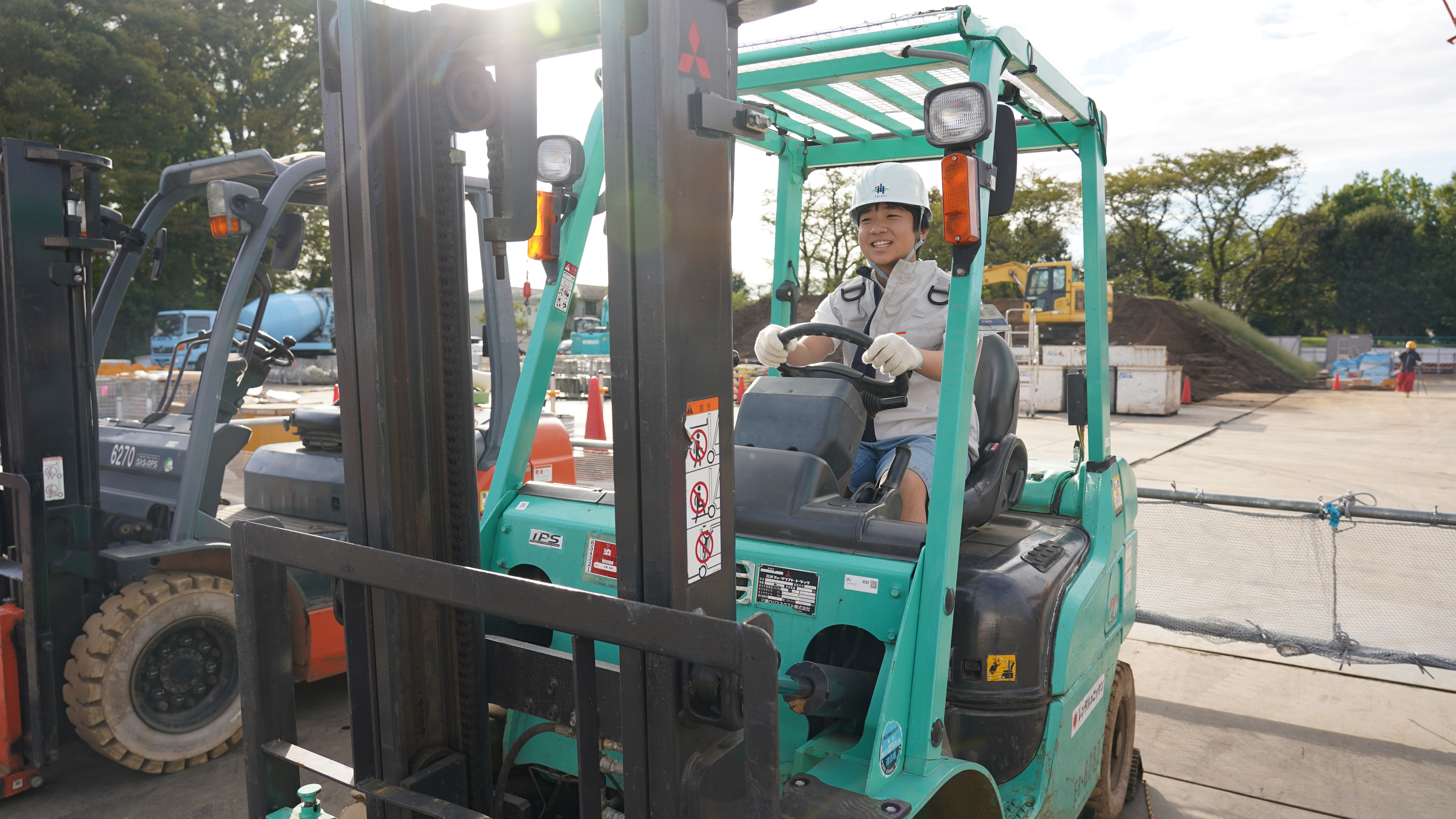 当日は、大成建設の塩見所長・櫻田副所長から建設の概要説明を受けたほか、クイズ形式の質問コーナーやフォークリフトトラックの試乗体験、作業服の試着など、子どもたちが楽しみながら学べる多彩なプログラムが用意されました。